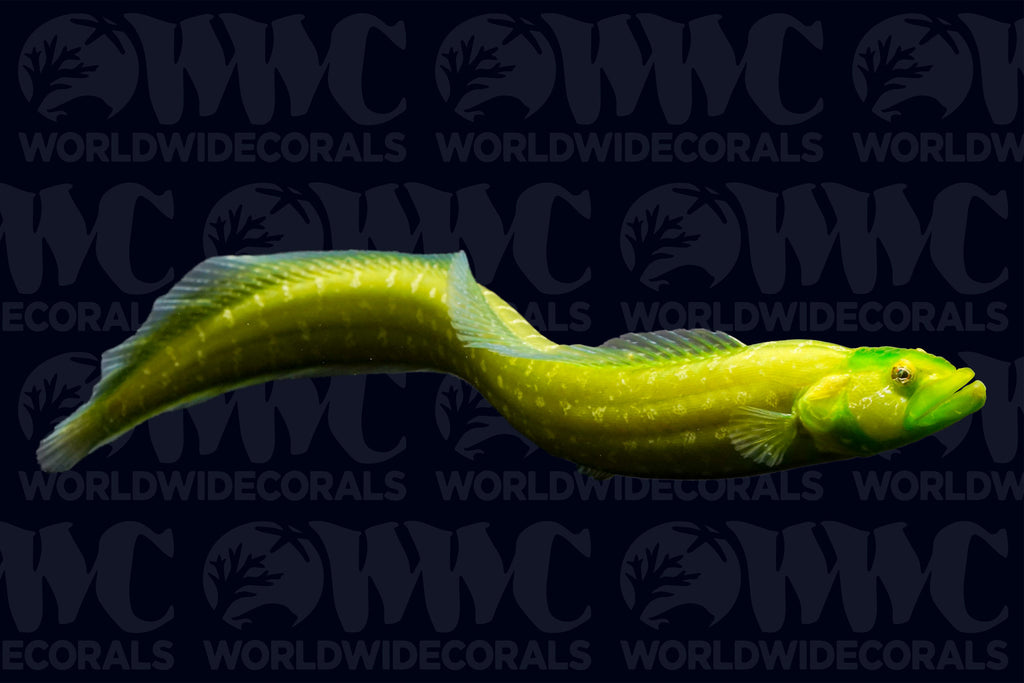 The name Green Wolf Eel is very deceiving because this fish is actually not an eel at all, but actually a Dottyback. They are brownish-green in color with an elongated body that resembles an eel. They have a mottled pattern that is very appealing. This species is considered to be reef safe with caution because they will not bother coral but will snack on small fish and sessile invertebrates that can fit in their mouths. The Green Wolf Eel will grow to be over a foot in size and will need an aquarium with substantial swimming space. They inhabit the coastal waters of the Indo-West Pacific up to 10 meters deep. The Green Wolf are also often found in brackish conditions.